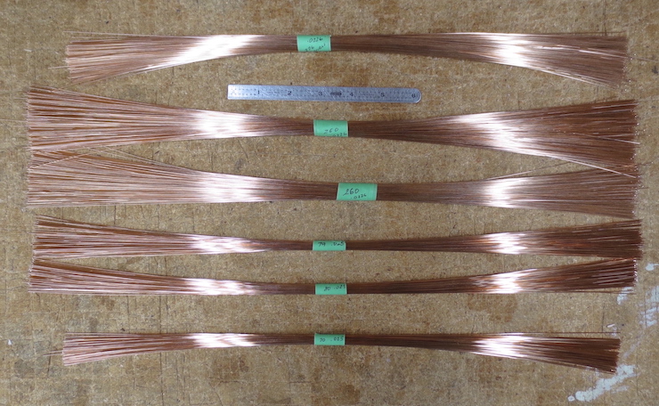 Above, a piece of .0226″ diameter 1/2 hard phosphor bronze wire right off the spool resting on some of the same wire that has been run through a straightener and cut into lengths. While not perfectly straight, the processed wires can be made into a laid facing.