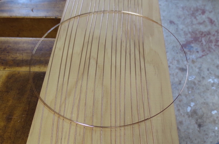 The top three bundles are .0226″ diameter 1/2 hard wire and will be made into laid facings for three moulds, two 12″ x 18″ moulds and one 10-1/2″ x 15-3/4″. The lower three bundles are .0254″ diameter wire and will be used to make the backing wires for these moulds. They are all to be “double-faced laid” (also known as “modern laid”) moulds.