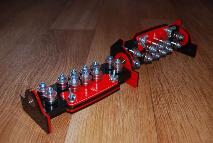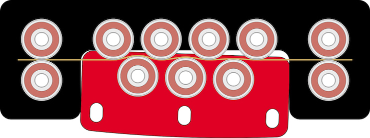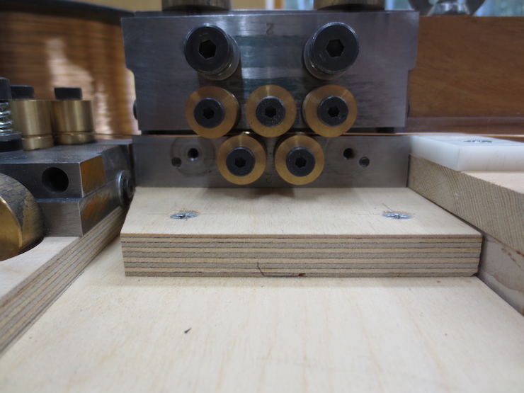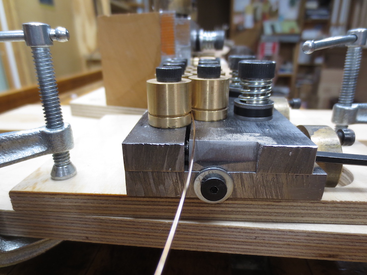 The horizontal bank viewed from above. You can see that the rollers are set to bend the wire back and forth and less aggressively as the wire moves from left to right. Adjusting screws are located at either end of the slot between the rollers and are accessed through deep holes in the front plate. The two tightening screws are visible at the bottom of the photo.
