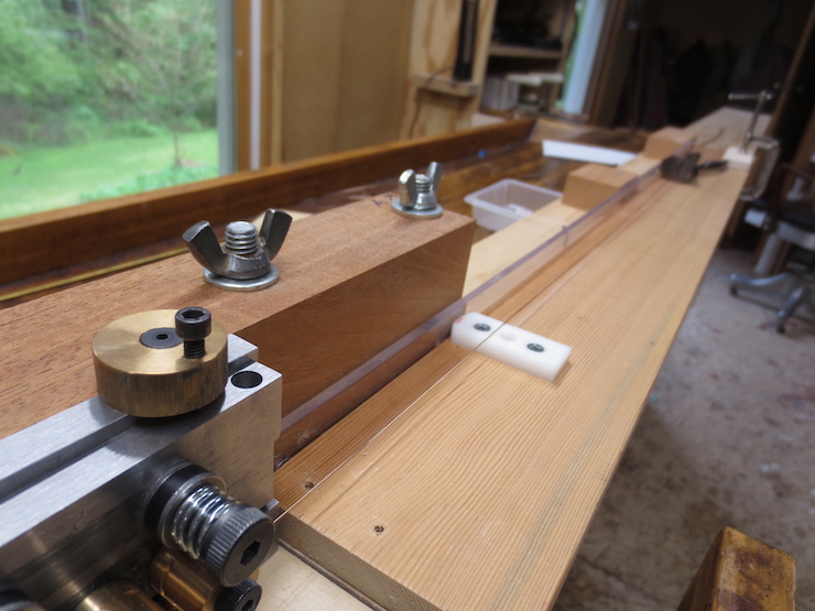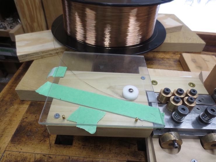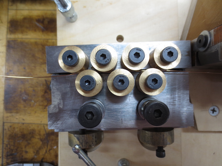 The wire is pulled between two sheets of polycarbonate. The bottom sheet is screwed down to the wooden base. The top sheet floats, held somewhat loosely in place by the two brass pins and by the white plastic (acetal) disk. A couple layers of tape hold the sheets apart so, when weighted, the wire is free to move. The wire is pulled past the disk while being held flat between the plastic sheets to hold the cast of the wire in line with the grooves in the first bank of rollers. This helps the rollers to work on the wire in a more uniform fashion.