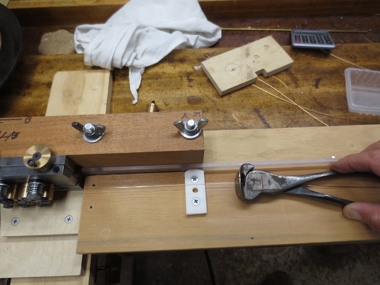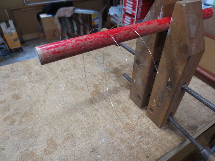 This is the wire straightener that I made using the information sent to me by Sergey. Ball bearings are stacked in pairs to create grooves which guide the wire back and forth to remove the cast. I expected that the wires should come out almost perfectly straight, like the pre-straightened wire I had been using for years. So, I was a little frustrated at first when the wires weren’t as straight. In retrospect this turns out not to be necessary or even desirable. If you try to make perfectly straight wires this way you may go crazy!