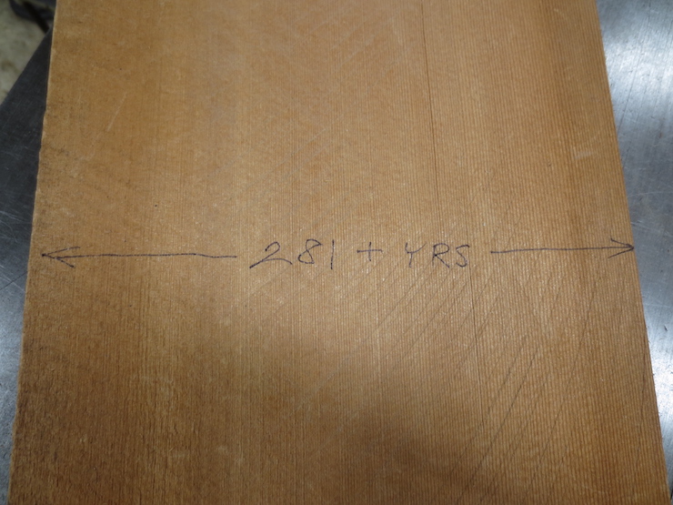 Here the wood has been re-sawn to eliminate the run-out. This piece had a crack that shows the orientation of the grain. I drew a line to accentuate this. The cracked part won’t be used for ribs; there is solid wood on the other side and the other blanks had no cracks.