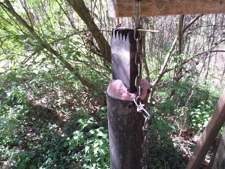 Boiling wood for mould parts helps to release stresses. Lignin, the substance that binds wood fibers together, softens with heat, allowing the fibers to shift slightly. This boiling tank is made from a 4″ diameter piece of iron pipe. The bottom end is threaded and bushings are screwed in place to reduce it so that a 110 volt water heater element can be screwed in. I bring the water to a boil with the wooden parts submerged then unplug it to let it rest for an hour or so. Then I bring it back to a boil before removing the wood.