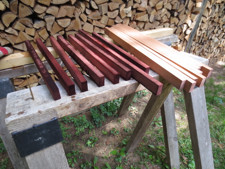 A tablesaw has been used to trim the other two sides parallel with the jointed sides. Thus the wood gets a little smaller with each step. The internal tensions are gradually reduced as the wooden parts get closer to their final dimensions. The time and work actually spent preparing wood this way is not great. However you must plan ahead a few weeks to allow for drying between steps.