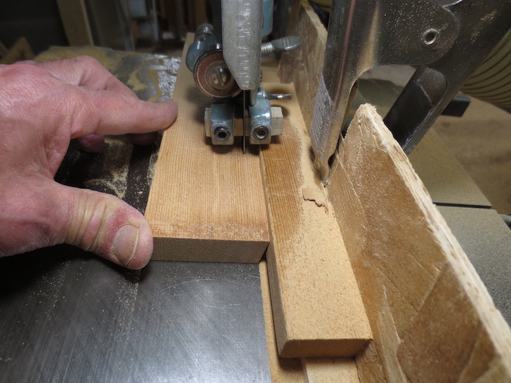 Deckle stock is prepared in the same way but it is shaped into a rough L cross section. In this photo the small scrap pieces that were sawn out remain very straight. This is a good indication that this wood is relatively stress-free.