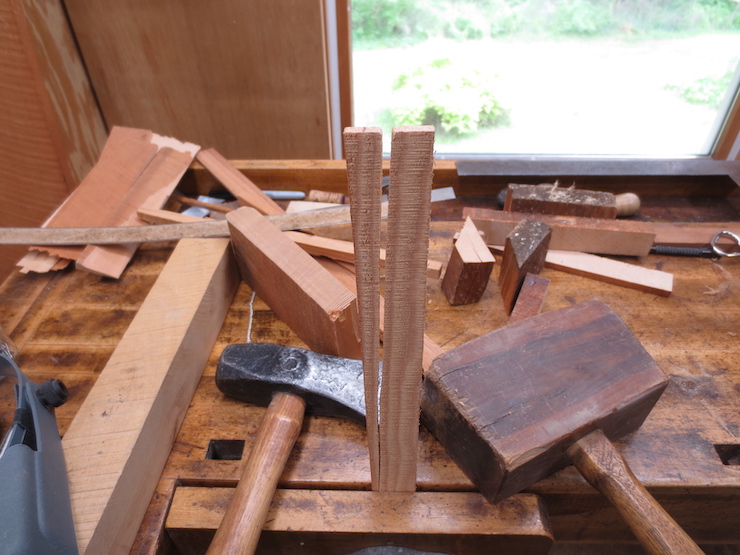 It is easy to see if a vertical grain plank has been sawn parallel to the growth rings. It is harder to tell if it has been sawn parallel to the trunk in the other orientation. Here I have split a scrap of the plank and found grain ‘run-out’. This is best avoided for delicate paper mould ribs. I will re-saw narrow sections of this plank to eliminate the run-out before sawing out the tapered ribs.