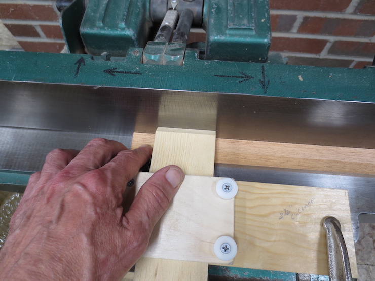 The guard is opened so the piece to be worked can be dropped in. The jointer is set to a very fine cut; about .005″-.010″. This is possible because the wood is already very flat.