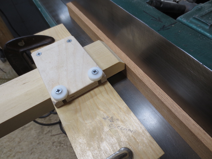 Here is the previously mentioned poplar demonstration block being sawn at a slight slant. I set the saw at 3 degrees (instead of the usual 1/3 degree) to make it easier to see. The usual angle is somewhat arbitrary, just enough to create two clean edges for the wood to ride on without having to joint too heavily to remove the saw cuts.