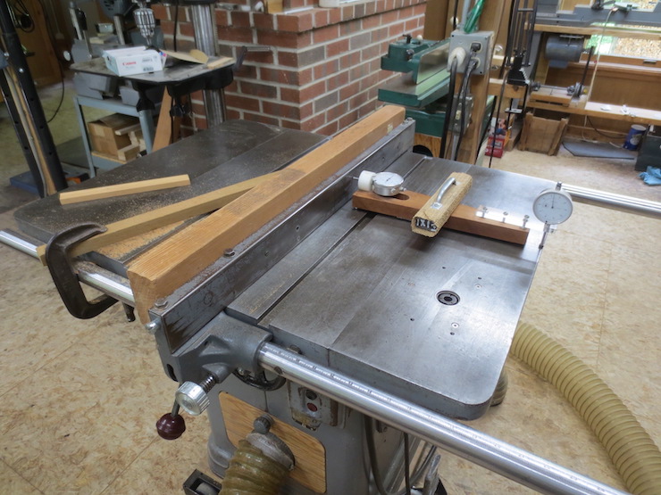 This photo shows how the home-made dial indicator fixture can be used to help adjust the fence very precisely. As the fence is moved laterally, the dial on the left will measure the change.