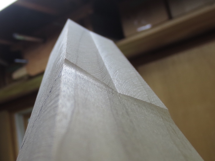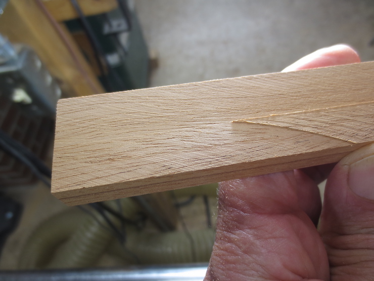 Shown above is a block of poplar that I shaped to demonstrate the method I use to make the frame pieces of even thickness. I used exaggerated angles to make it easier to see.