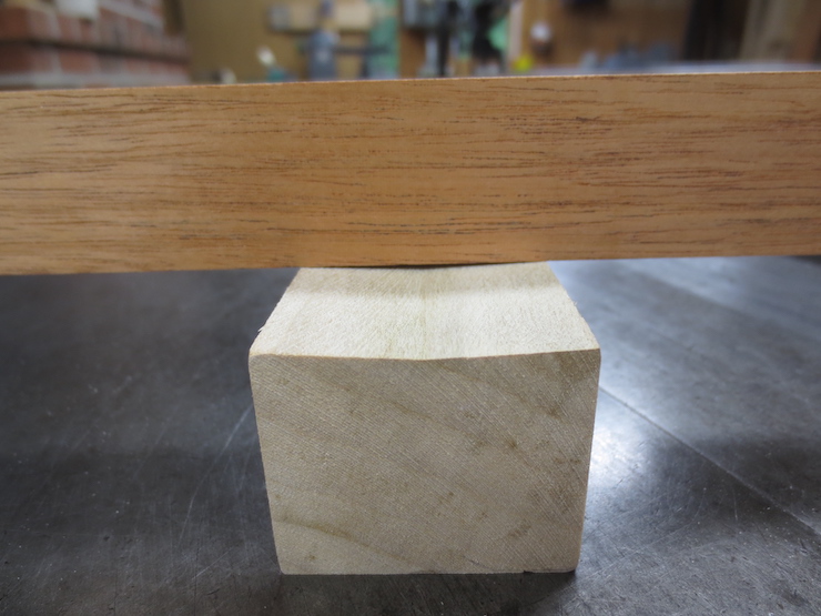 The hollow is visible beneath the straight edge. When the piece is turned over only the outer edges will ‘ride’ on the jointer table as the saw cuts are planed off.