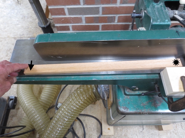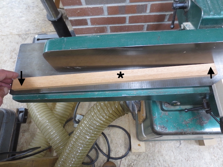 One end will move and the other stays in the same place. It pivots near the star at the right. This shows that the piece is hollow (microscopically) but this is better than having a belly. Woodworking planes work this way. If you are preparing to join two pieces of wood, set the plane for a fine cut and try to make the edges hollow. The tool will not allow that to happen (except to an insignificant degree). The next 4 photos will attempt to show a machine process of slightly hollowing a piece first, then jointing it flat. It ends up sounding kind of insane but what I’m trying to describe becomes pretty intuitive once you get the hang of it.