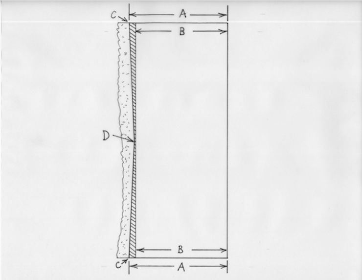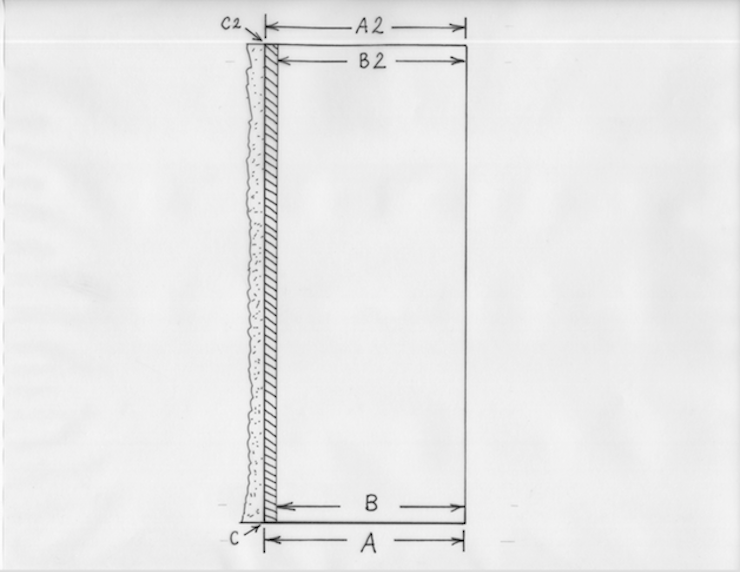 In the drawing above the rectangle on the right represents the desired final width dimension (B) of the mould frame in cross-section. On the left the rough, DOTTED area represents the part to be sawn off. This in preparation for planing off (on the jointer) the DASHED area. If you try to saw the frame stock to width in one pass some problems may occur. To make the bottom dimension (A) the same as the top dimension (A2) will take very careful adjusting of the tablesaw. No matter how careful you are the two are not likely to end up the same. For one thing at the top edge of the wood (along C2) the circular saw blade will be cutting 1-1/4″ to 1-1/2″ above the tablesaw surface while along the bottom (at C) the wood will rest on that surface. Dimension “A” is likely to remain very consistent while dimension “B” may vary a bit with slight differences in pressure as the wood is fed through the saw. Circular saws can ‘flutter’ which is likely to cause a slightly more irregular cut at the top than at the bottom. This may leave a surface that is not functionally flat; it may rock slightly on the jointer. If it rocks at all, the thickness will not be consistent after the rough saw marks are planed off.