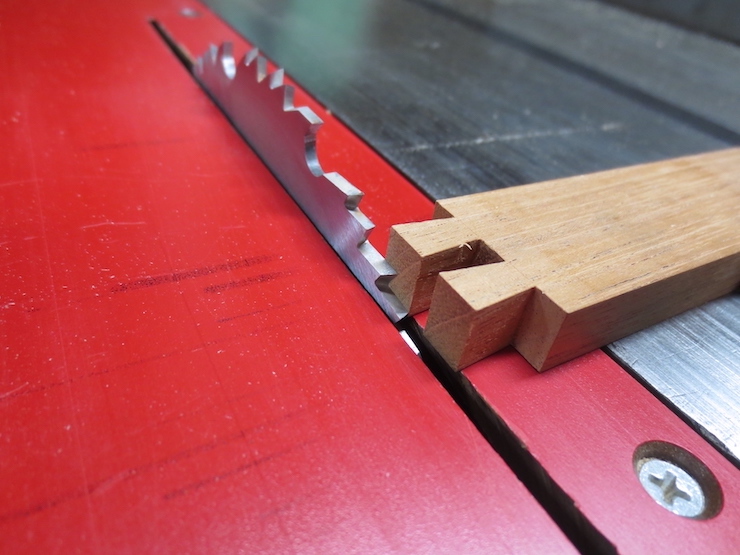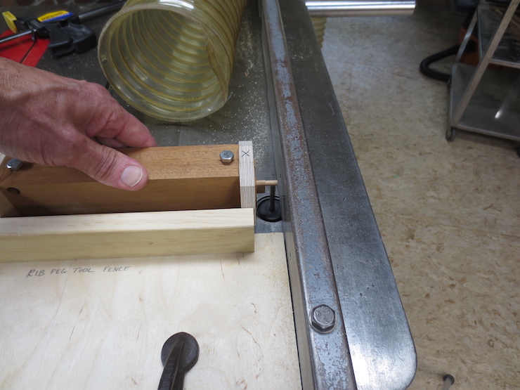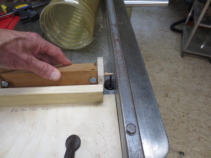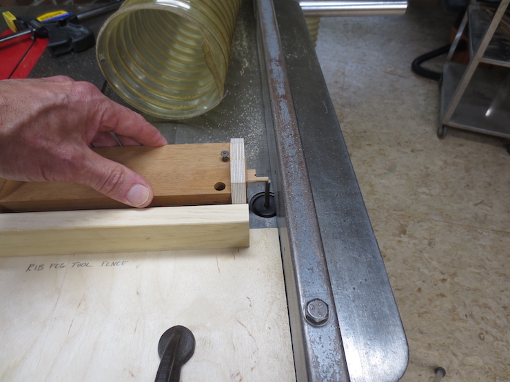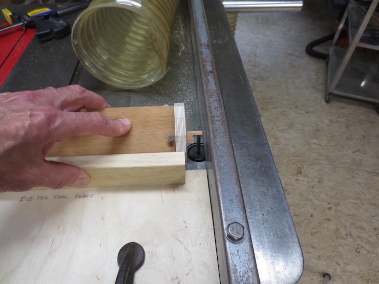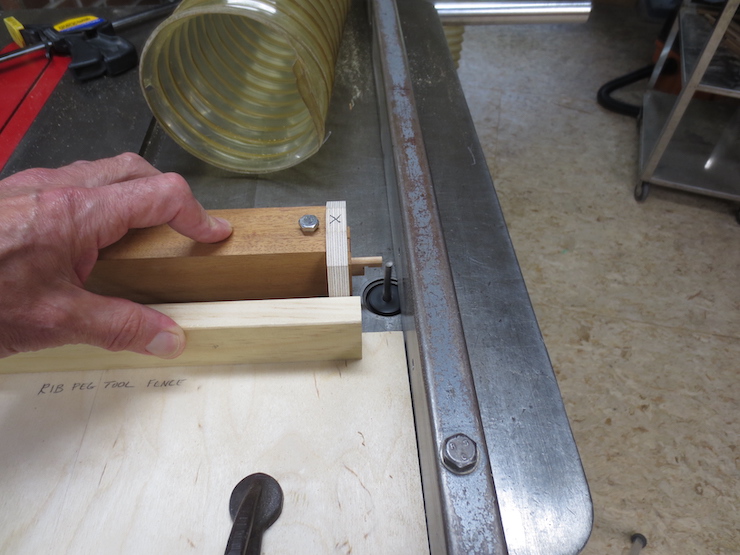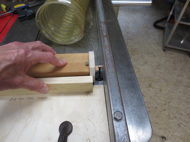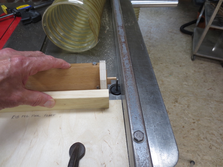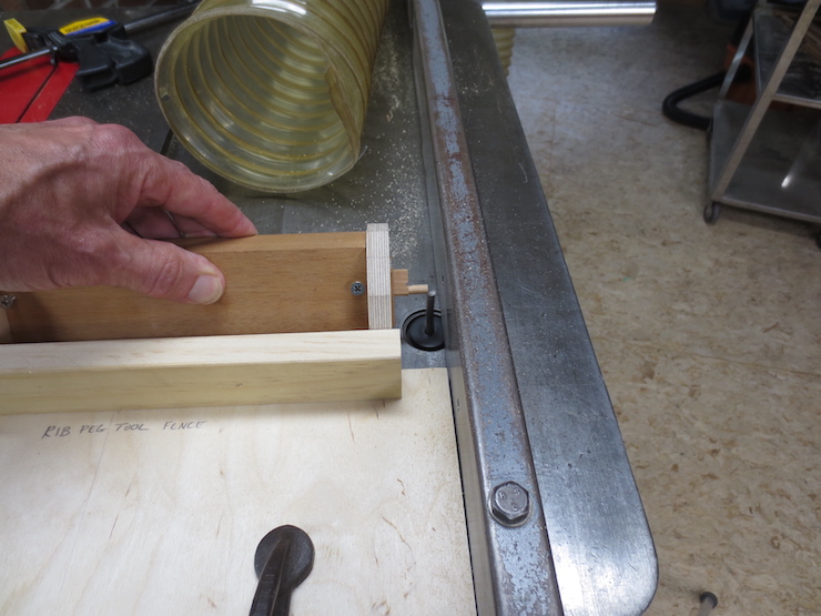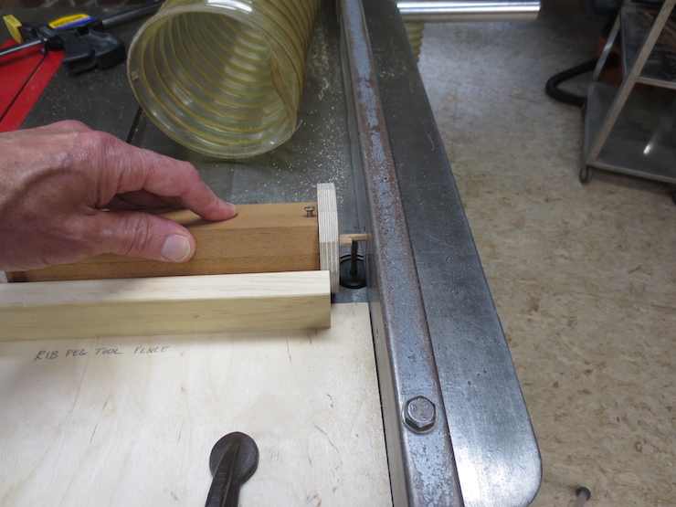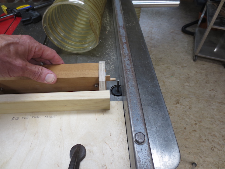 The steel table saw fence is adjusted so the peg can be machined for its full length without damaging the previously cut shoulder. The wooden fence guides the rib peg tool while it is slid back and forth and keeps the rib centered over the router bit. The height of the router bit establishes the diameter of the faceted peg.