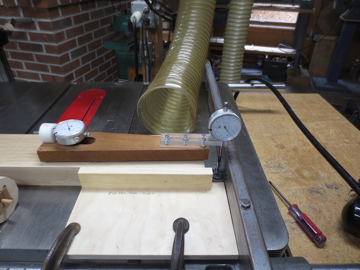 After making a test cut the dial indicator can be used to make slight adjustments to the height of the router bit to give the peg a good fit with the holes in the test blocks.