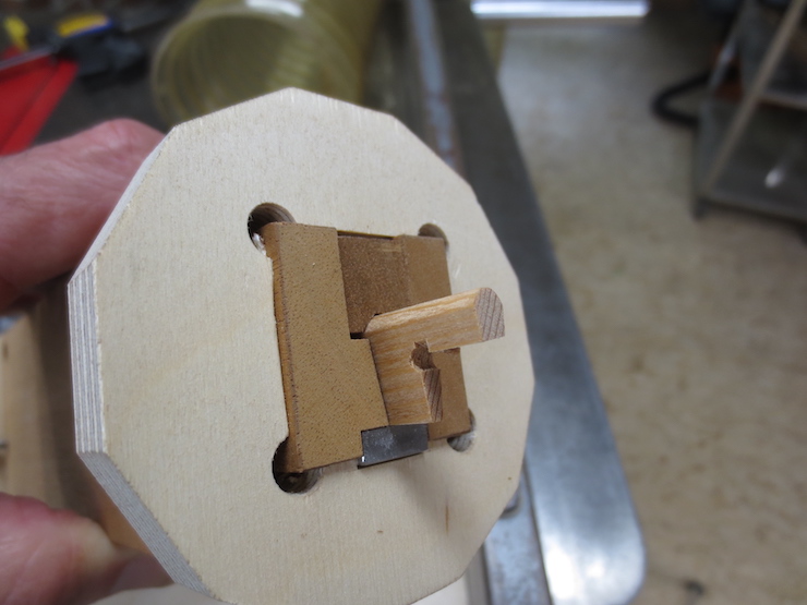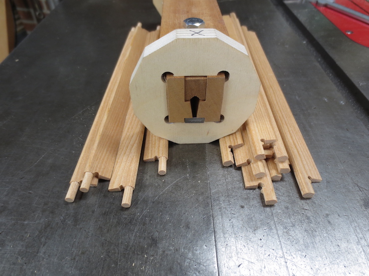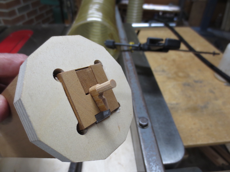 This slide show illustrates the steps of routing a peg on the end of a rib. Notice how the tool makes a complete rotation in 12 steps; each corresponding to one facet of the peg. Keep in mind that for each step the tool is slid back and forth so the router can shape the complete length of the peg (this doesn’t show well here). The router bit only machines the facets of the peg and doesn’t quite touch the shoulder of the rib.
