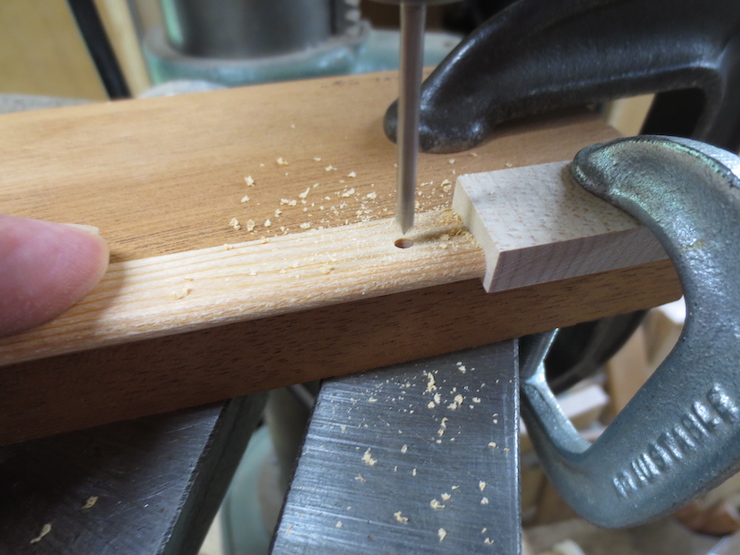 1/8″ diameter holes are drilled where the rib peg will meet the shoulder of the rib. This is a stress point and the hole, at least in theory, spreads the stress over a wider area to help avoid splits here.
