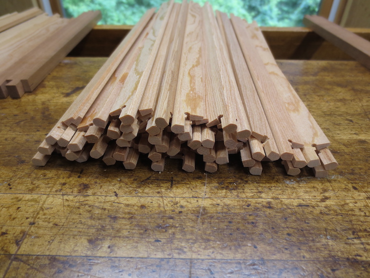 Paper Mould ribs connect with the outer frame by means of small pegs formed on their ends. These rest in holes bored into the frame at regular intervals. The ribs on the left have finished pegs; on the right they are only partly completed. The tool in the middle is used to machine the twelve sided pegs.