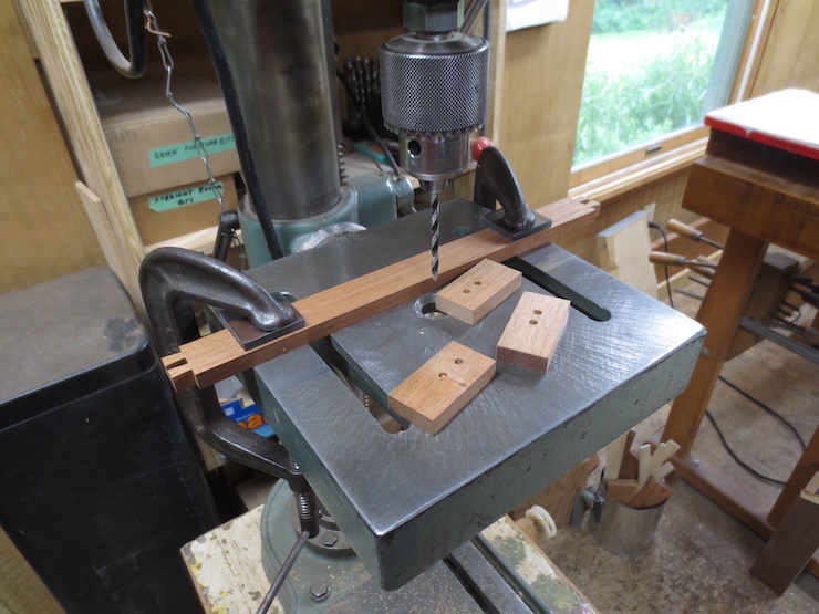 Holes are drilled in a few scrap offcuts. These will be used to test and adjust the fit of the rib pegs. Later the same drill will be used to prepare the mould frame to receive the ribs.