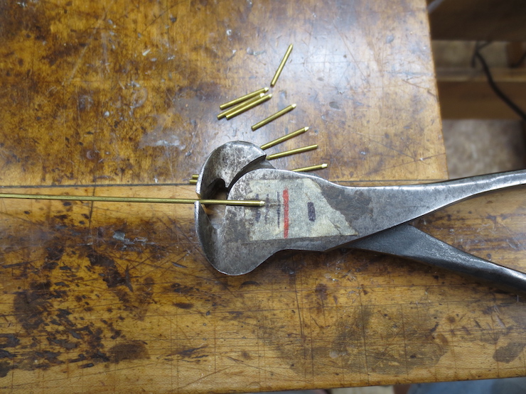 A piece of rod is pointed on a grinding belt and pieces trimmed off to length with these flush cutters. I grind the other ends flat to make them drive better when they are hammered in.