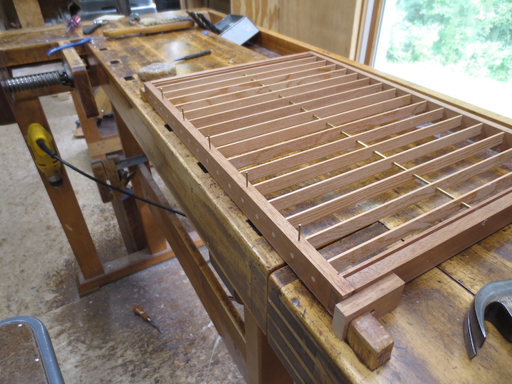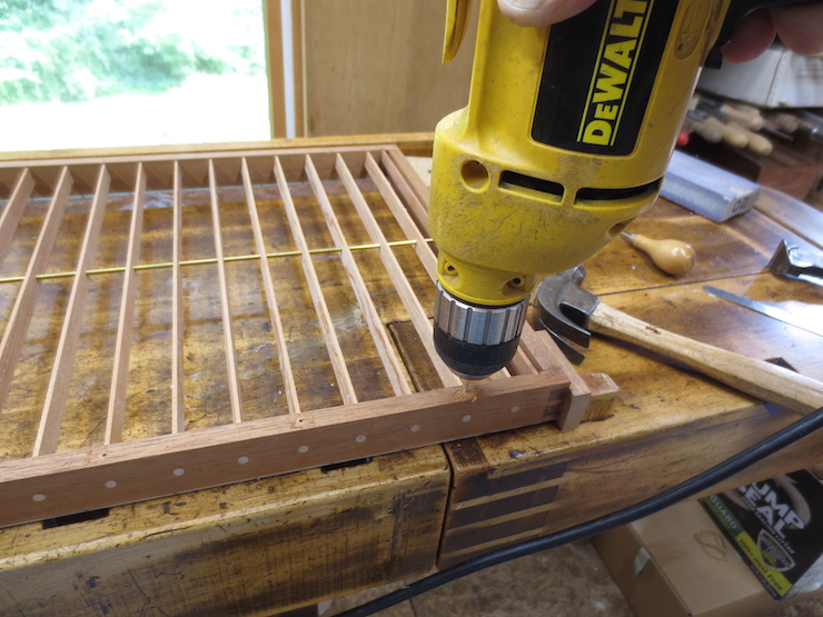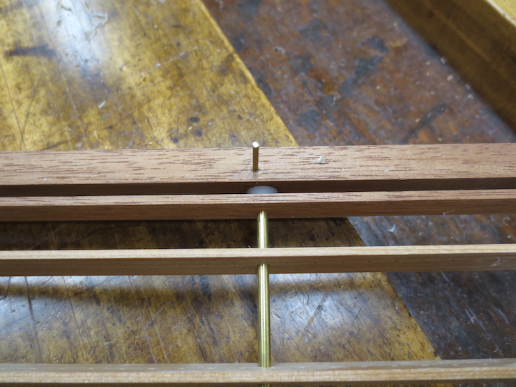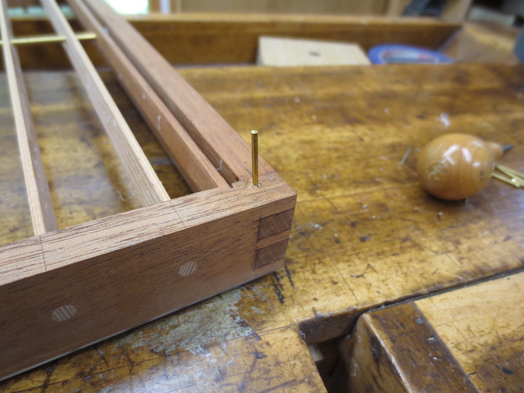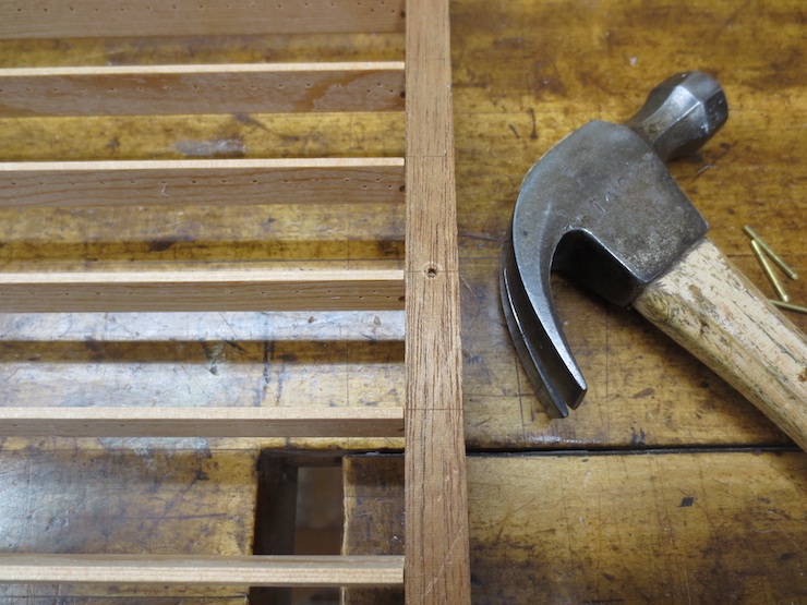 Metal pins are used to improve the connection between the parts of the mould. Holes are drilled and pins are driven down through the frame and rib pegs. These are made of 1/16″ unfluxed brazing rod that I bought from a welding supply house. Ribs are not glued and the pins make certain that the sides of the mould don’t spread.