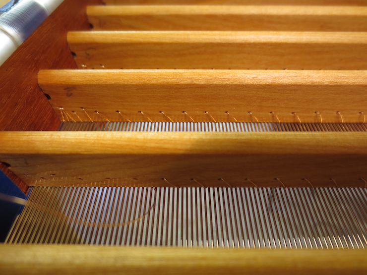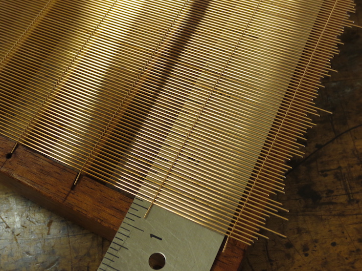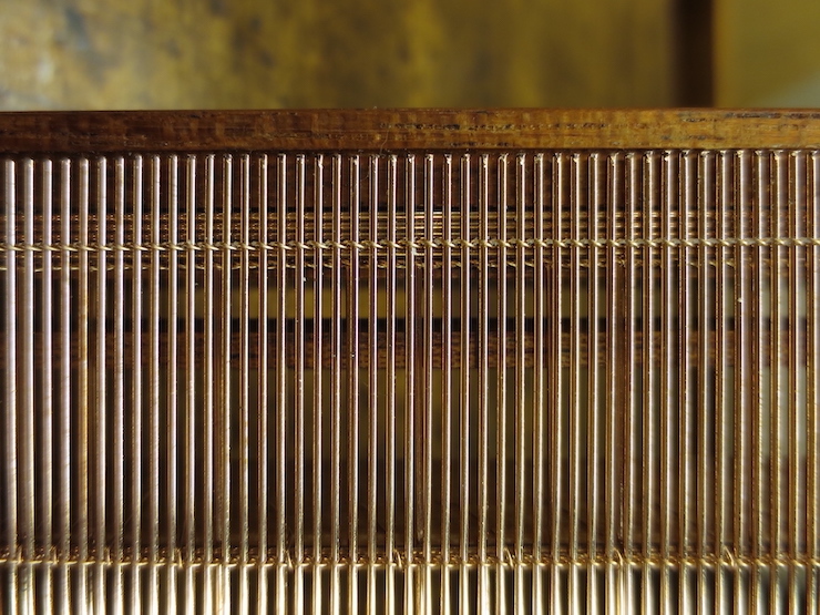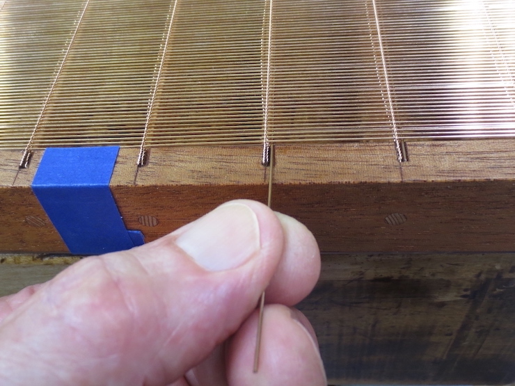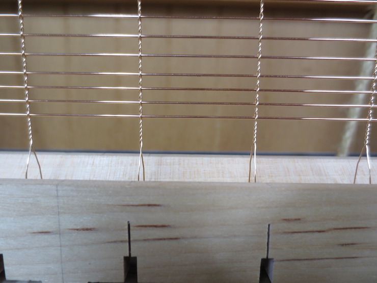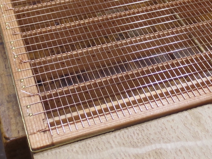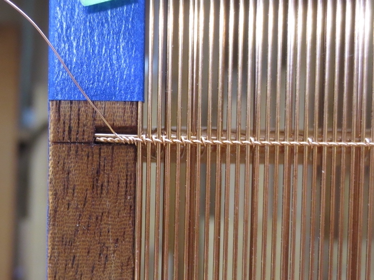 (below) The very bottom of a large backing that is finished and ready to cut off of the loom. Three half-twists in the chain wires keep the laid wires widely spaced. The last four laid wires are more closely spaced with two half-twists in the chain wires. Including a few narrow spaces along one edge makes it easier to fit the backing to the mould frame.