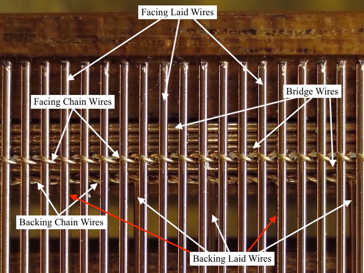 ~loose chain wires vs. sewn chain wires: With the exception of one chain wire at each end all of the chain wires of a mould are fastened in place, each being sewn to a rib. The two ‘loose’ chain wires at the ends can’t be sewn to a rib. To secure them they are ‘trapped’, either in a groove in the wooden frame (single faced laid and wove) or between two bridge wires (double faced laid).