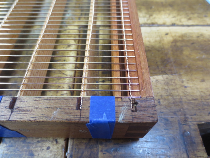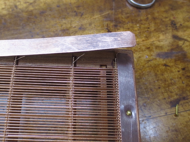(above) A copper strip has been tacked to both ends of this mould. It protects the ragged ends of the laid wires while holding the ‘loose’ chain wires (facing and backing) and bridge wires in place. The strips along the sides do less; serving only to protect the twists. If not covered the ends of wire are vulnerable and likely to be snagged and bent. In moulds receiving hard use chain wire twists sometimes escape from their covering and will be bent, first one way, then another. They eventually fatigue and break, most likely right at the first laid wire. The chain wire will loosen near the break and laid wires may come loose, too. The copper strips at the ends sometimes work loose, allowing laid wires to protrude and become damaged.