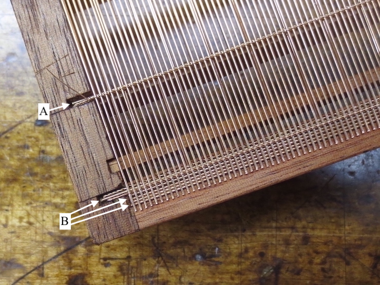 (below). You can see both uses for bridge wires here; at “A” as one piece of the bundle of wires sewn to a rib, and at “B” lined up in a group to support the ends of laid wires where they lap over the frame end.