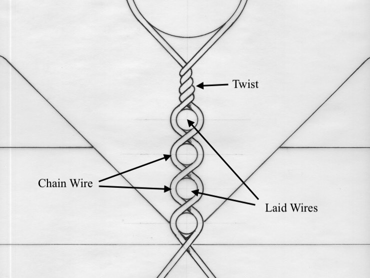 ~chain wire / chain wires: These words are especially confusing to use. I will use the singular “chain wire” in these posts to mean a single pair of wires that spiral around each other, binding laid wires side by side to make a facing. Visually it appears as a single line of wire, resembling a miniature chain, crossing the laid wires at a right angle. I will use the plural “chain wires” to refer to more than one of these structures. Examples of the two uses might include: “Each rib has a chain wire positioned above it.” And “All of the ribs have chain wires positioned above them.” (It is awkward to write many times about “chain wire pairs”. And what is the plural of “chain wire pairs”?)