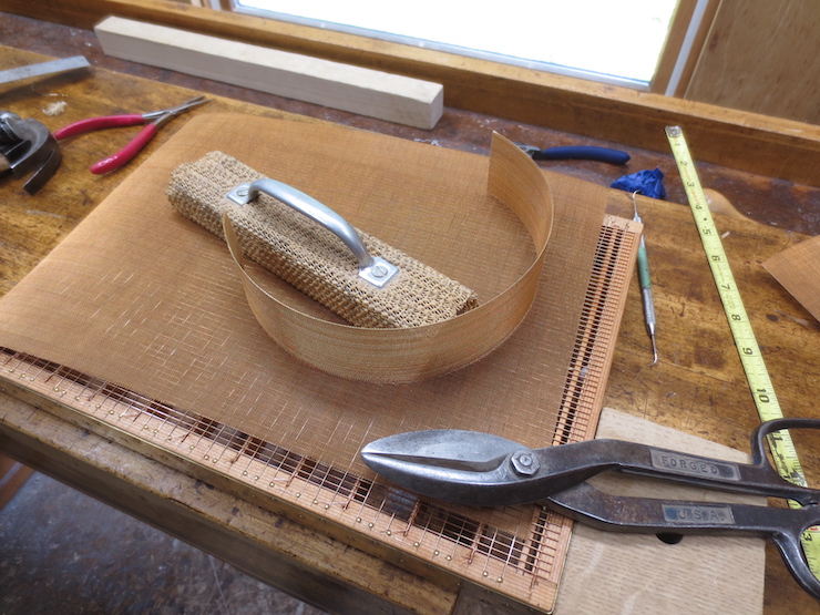 (below) The same twist has been tightened and will be trimmed to fit in the notch. After the mould is sewn all of the twists will be covered by copper edge strips to protect them.