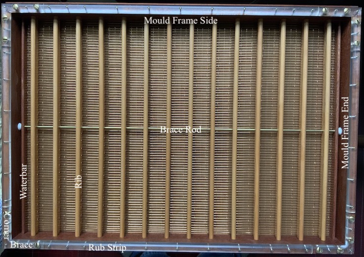 (above) The underside of a wove mould. This photo identifies the frame sides and frame ends along with a few other parts of a paper mould.