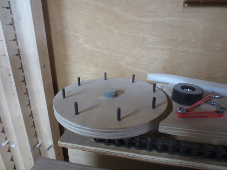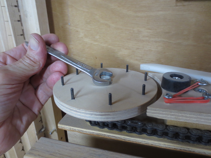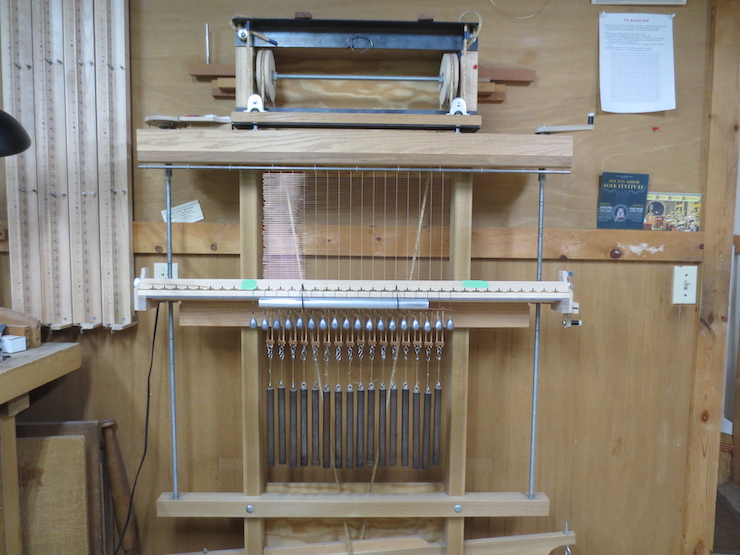 As many spindles as needed are put in the holes in the spindle rack. Then they are wrapped with the weighted cords that drive them to twist the wires.