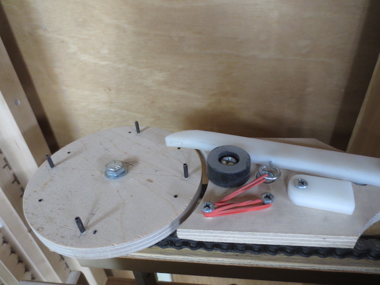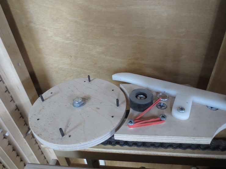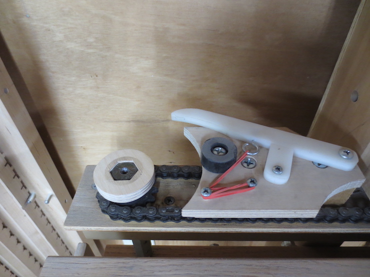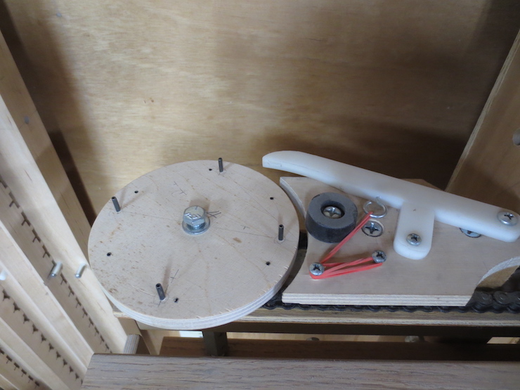 After a laid wire is added by twisting the chain wires the whole ‘web’ is lifted by the treadle (not shown). This engages the untwisted parts of the chain wires in the cross-wise slots in the wire trough. This prevents the spindles from turning backwards when the weighted cords are released by reversing the twisting crank. The cords slip on the surfaces of the spindles since the cord is only pulled from one direction (the weighted end). The spindles re-align themselves each time the cords are released.