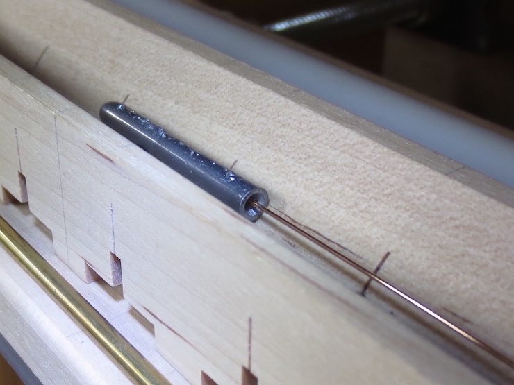 The aluminum angle taped in place helps guide each laid wire into the small hole in the end of the wire guide.