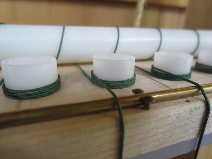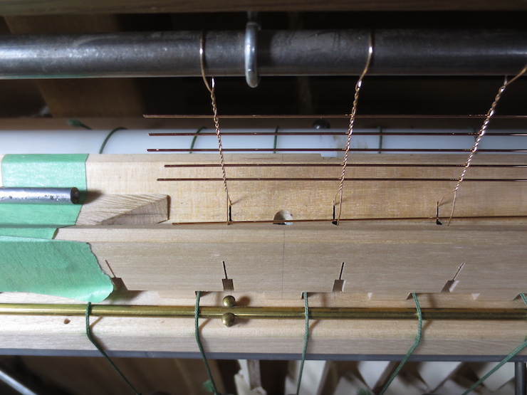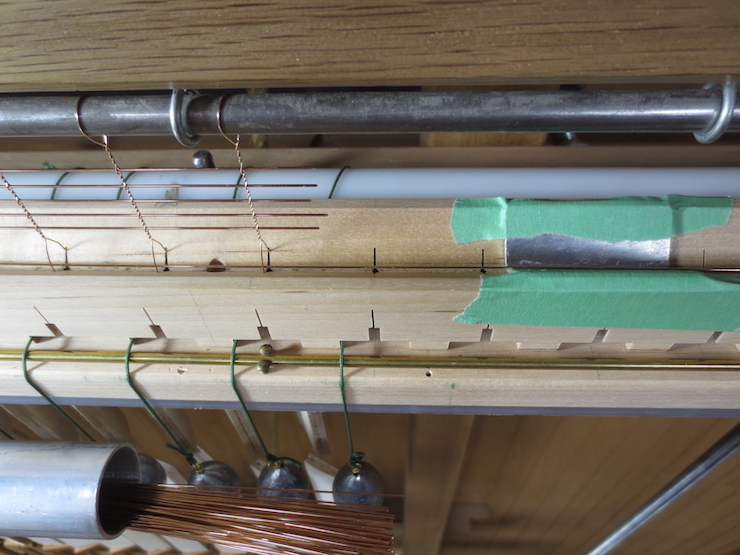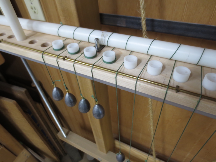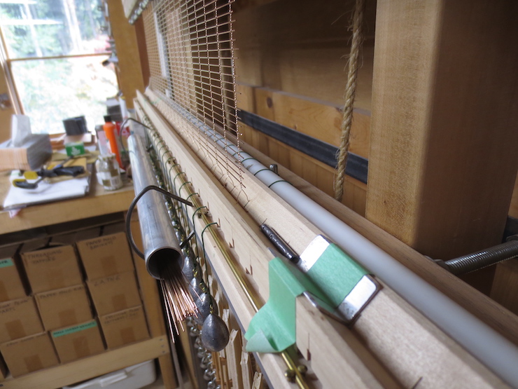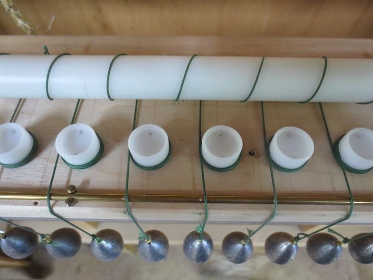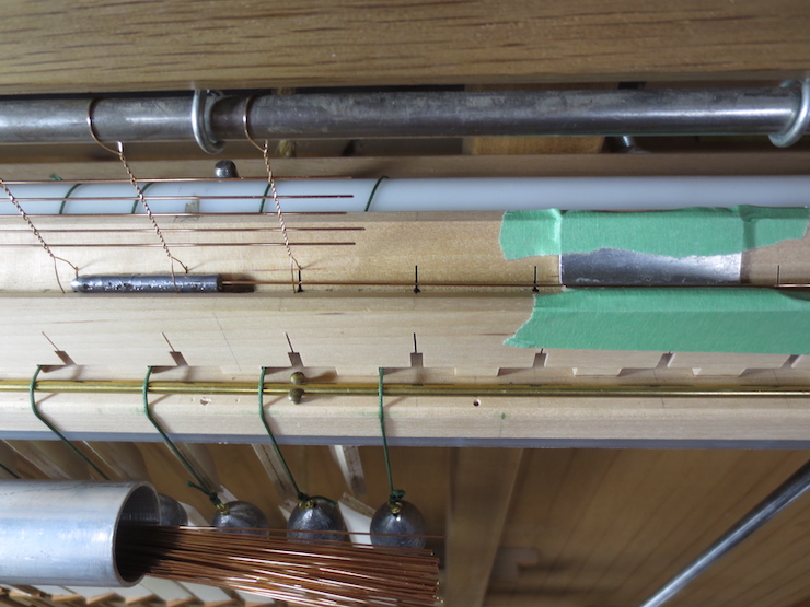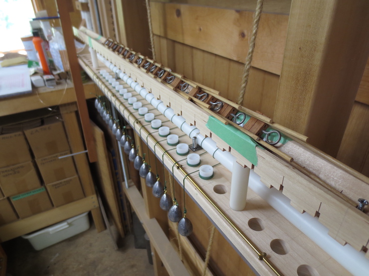 Lengths of wire have been draped over a bar at the top to form pairs. The two ends of each wire pass through a cross-wise slot in the wire trough, down through holes in the spindles, through holes in the wire slides and are twisted tightly together at the bottom. Then a one pound weight is hung on the wire slide at the end of each pair to hold the wires taut.