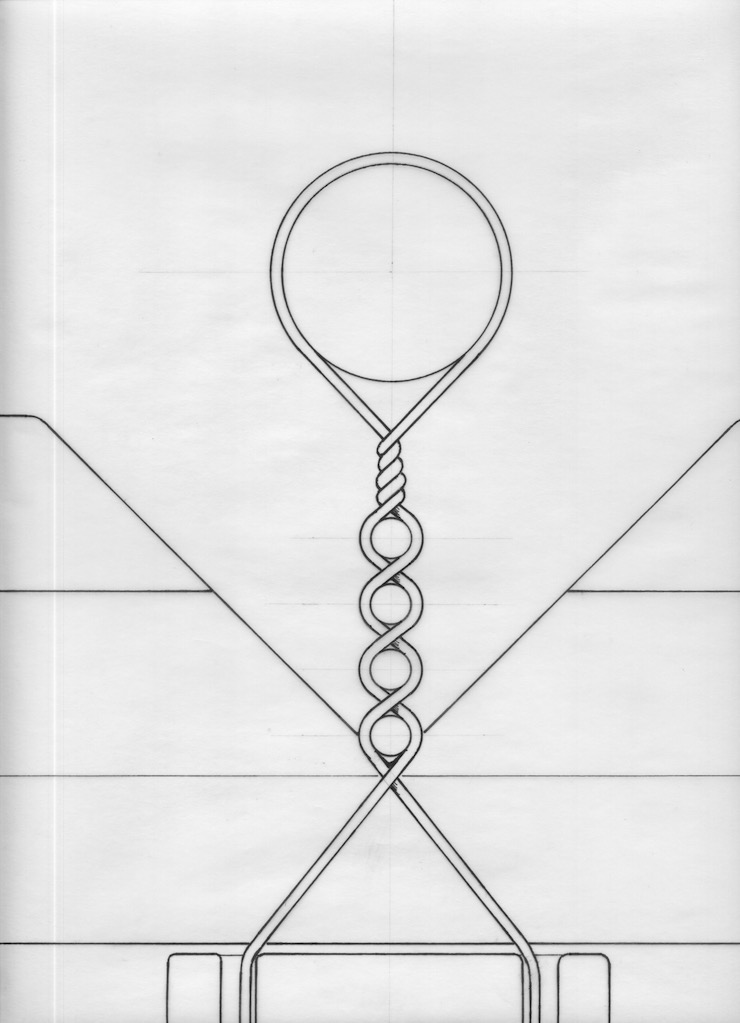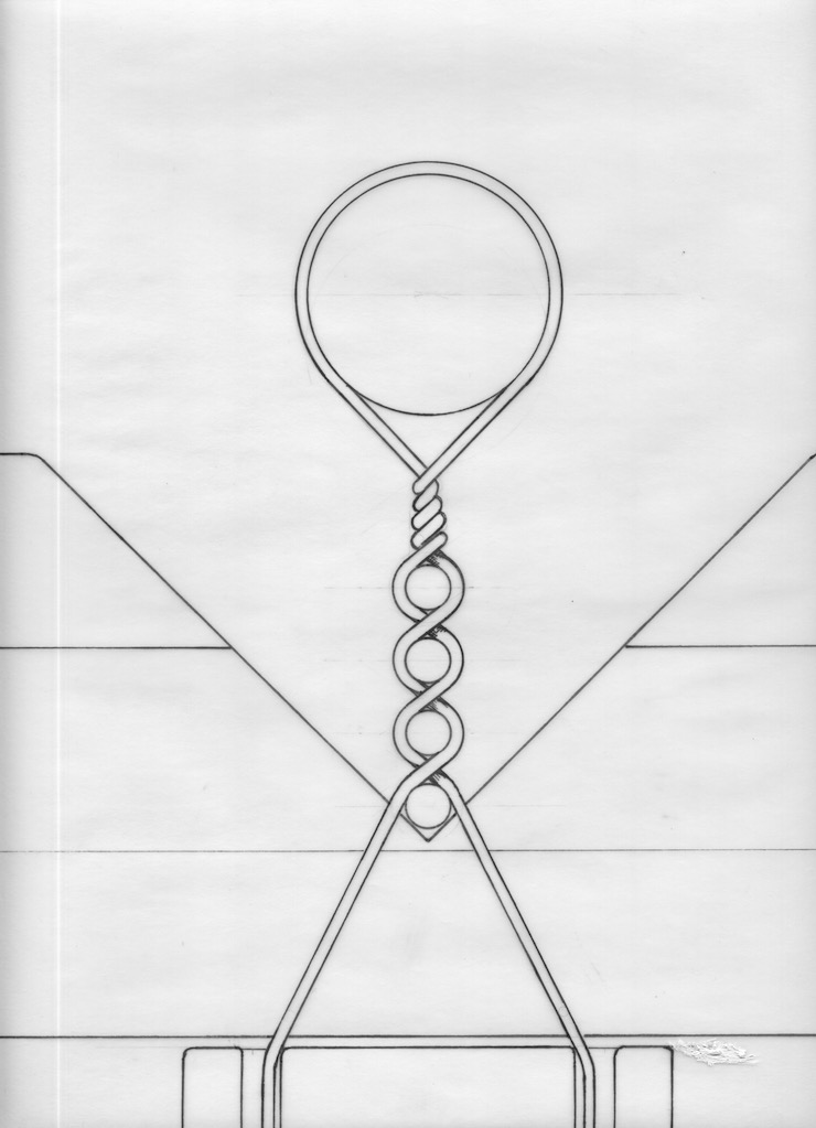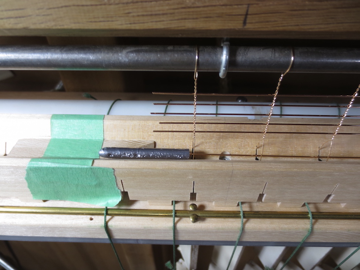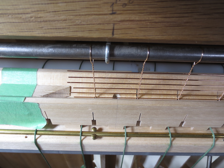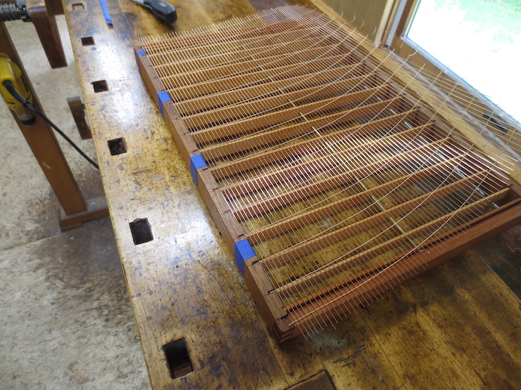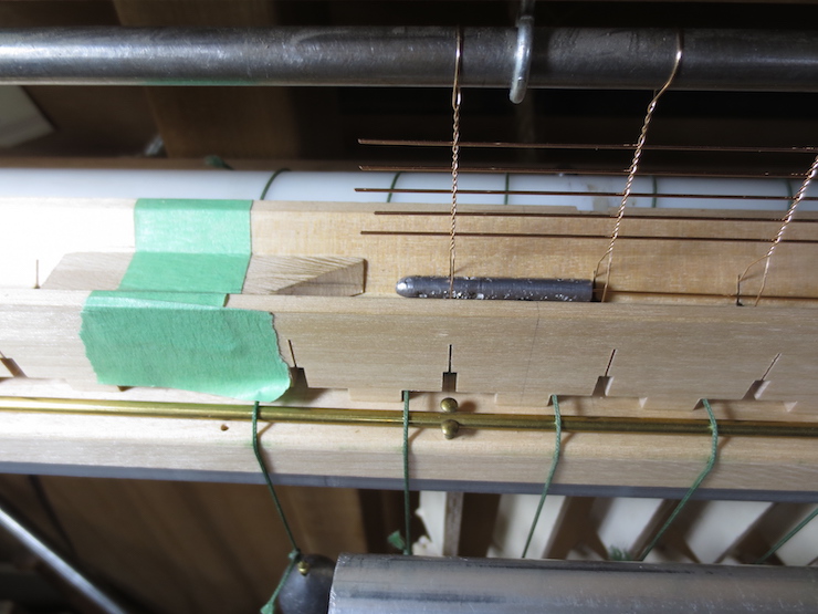 Lengths of wire have been draped over a bar at the top to form pairs. The two ends of each wire pass through a cross-wise slot in the wire trough, down through holes in the spindles, through holes in the wire slides and are twisted tightly together at the bottom. Then a one pound weight is hung on the wire slide at the end of each pair to hold the wires taut.