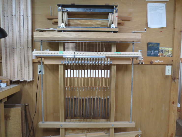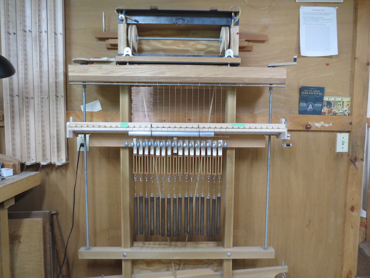 Some of the parts of the loom are labeled here. The wire lifting beam lifts about 1/2″ when the treadle is stepped on. This lifts the chain wires so a new laid wire can be slid down the trough between their splayed ends. With this loom different spindle rack/wire trough sets must be substituted to change the chain wire spacing. The narrowest spacing possible for this loom is 13/16″ on center.