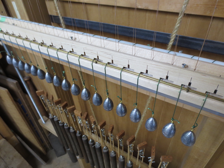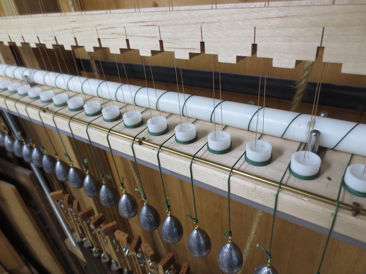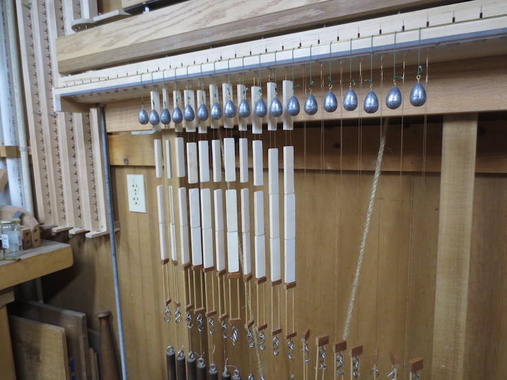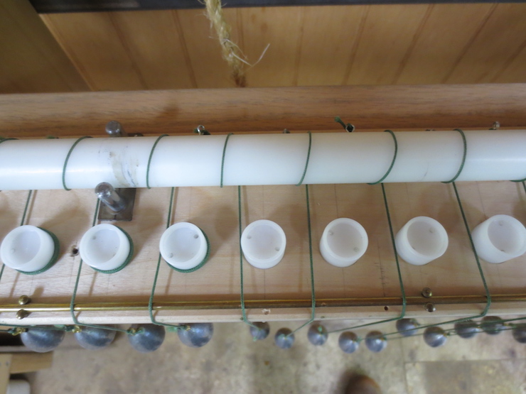 After all spindles are rigged with cords and weights they are aligned by turning them clockwise. They can’t be turned backwards; the cords tighten and prevent turning counter-clockwise.