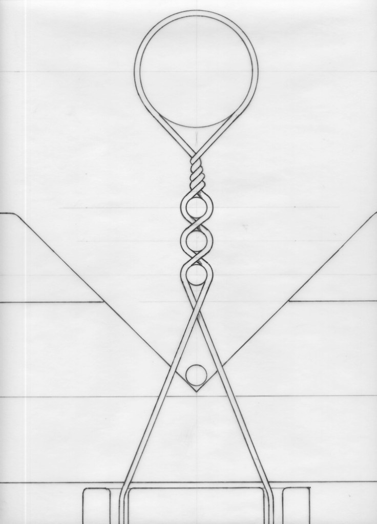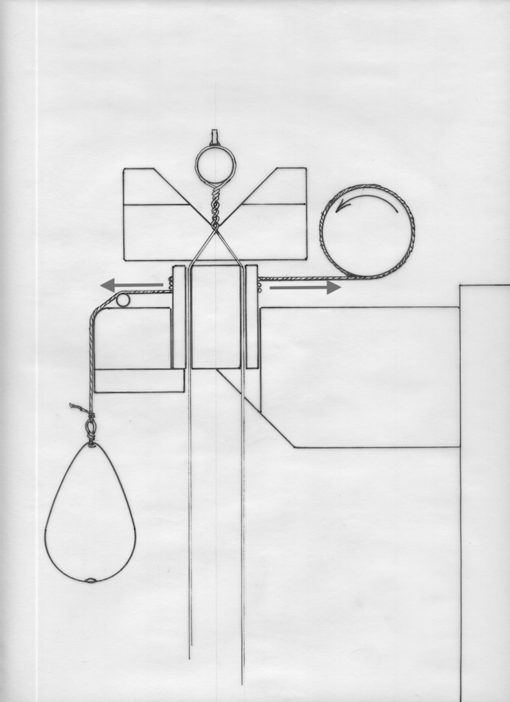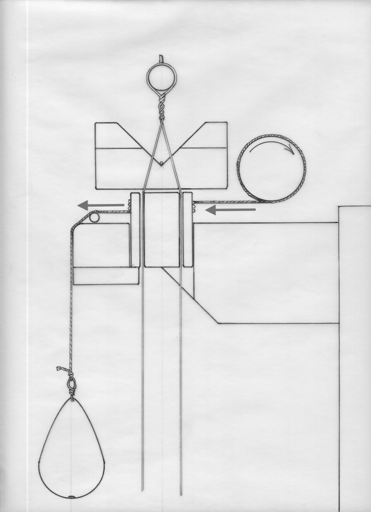 This drawing shows a cross section through a spindle, wire rack and wire trough. When the twisting crank is turned (in the direction shown by the curved arrow) the cord is reeled in and the spindle is turned. When the cord is pulled to the right it is tightened from two directions (as shown by the two straight arrows) so it cinches down on the spindle and turns it. This twists the pair of chain wires 1/2 turn.