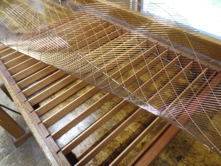 This is about the heaviest wire that is useful for making chain wires. It is .015″ diameter soft phosphor bronze and makes the chain wires for this laid backing. Wove backing uses a .013″ diameter wire for a narrower space between laid wires. Laid facings can use almost any size chain wire between .012″ and .008″ diameter.