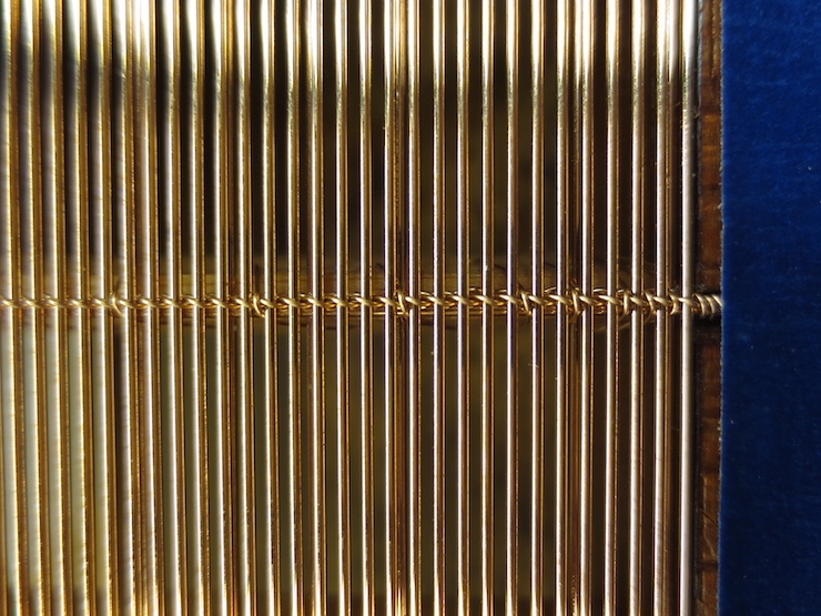 In the photos you can see ‘clumps’ where the backing laid wires interact (visually) with the upper laid wires. This helps you identify the right space to thread the wire through (the same above and below the rib) to avoid crossing a laid wire. Another trick is pulling the sewing wire gently to one side to flex the laid wire sideways to visually indicate the space the sewing wire should pass through on the other side of the rib. It is a good habit while sewing to touch the top of each stitch after it is made (where it crosses the chain wire) to make sure it ‘feels right’ and hasn’t left a ‘bump’ from crossing over a laid wire.