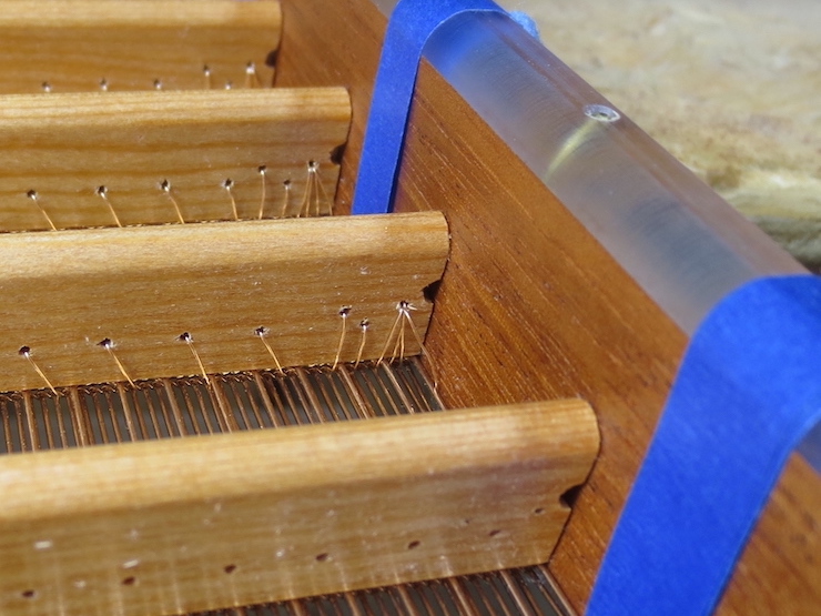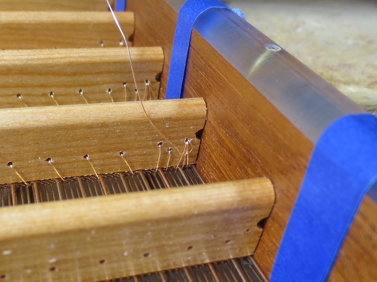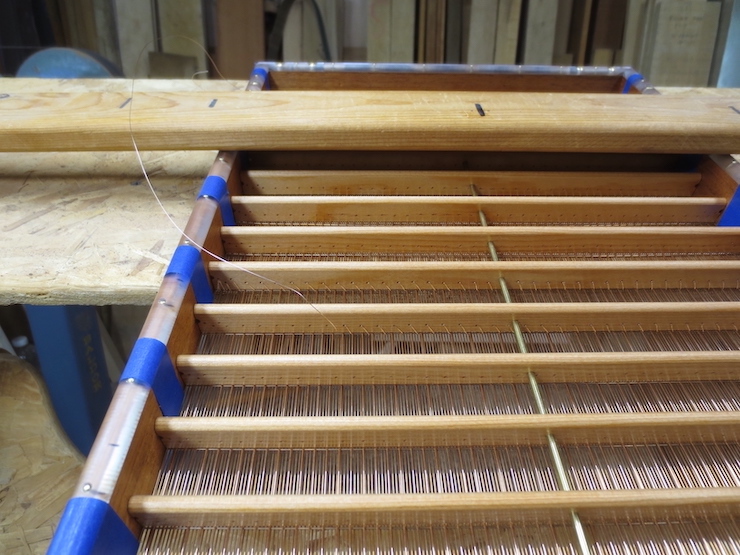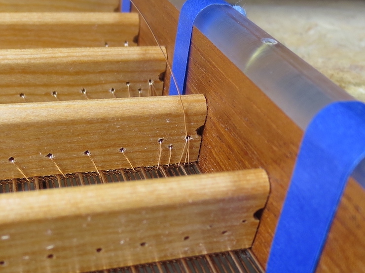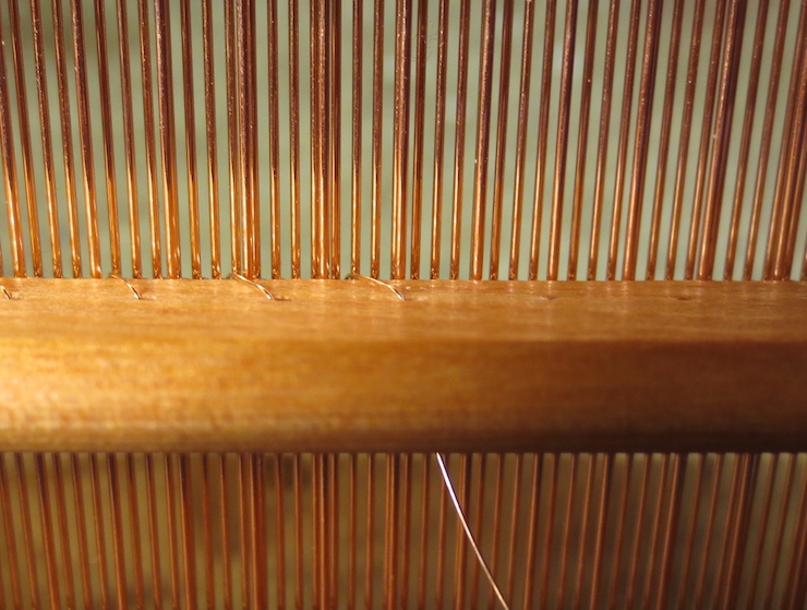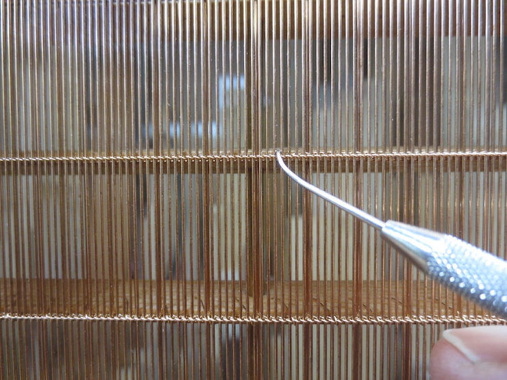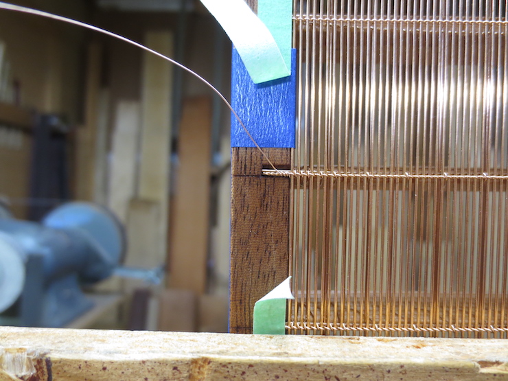 Backing and facing wires have been fitted to this mould; the next step is to sew them to the ribs. A soft (annealed phosphor bronze, in this case .010″ diameter) sewing wire follows a spiral path for the length of each rib to bind the wires to it. The ribs have been drilled at regular intervals to put a stitch in every sixth space (over the chain wire between pairs of laid wires) except at the ends where the stitches are closer.