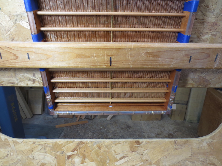 This first rib of this laid mould is ready for sewing. It is one of the middle ribs, the seventh from the bottom. The mould is angled down to allow the holes in the rib to be seen from above so the sewing wire can be fed through them from that direction. Sewing commences from the middle of the rib towards the right hand end. After the right hand side is completed the mould will be tilted up so that the holes can be seen on the other (lower) side of the rib. This is necessary because now the sewing is done from right to left and the wire must enter the holes from the opposite direction.