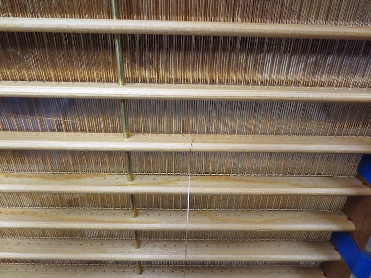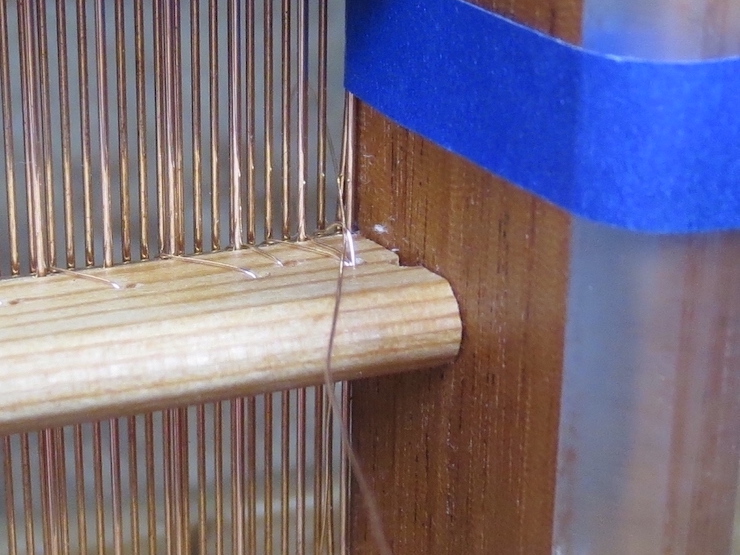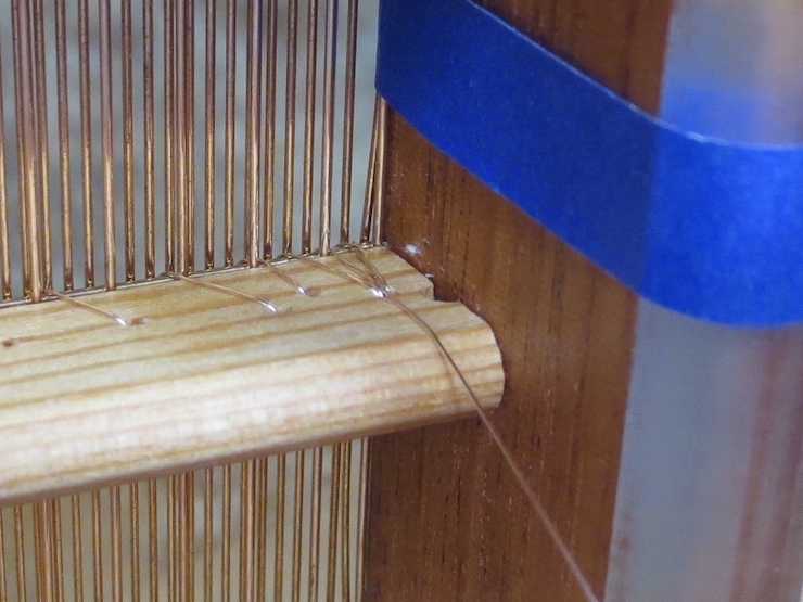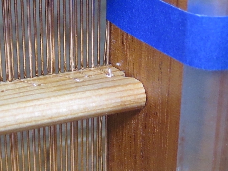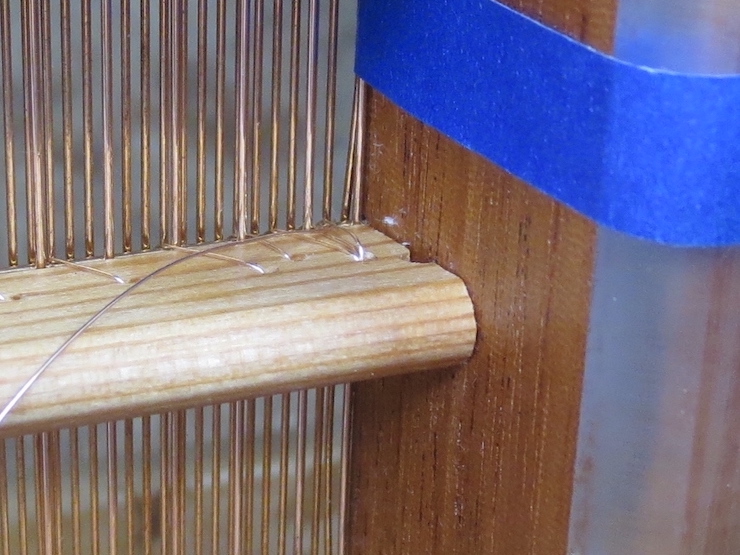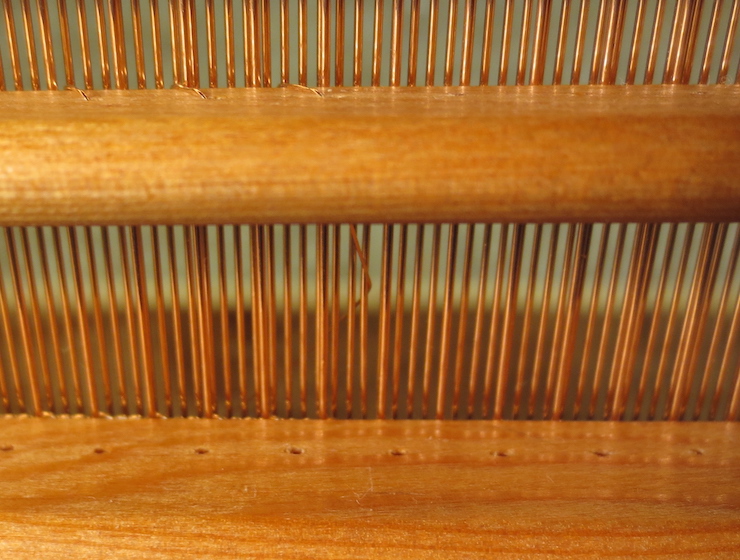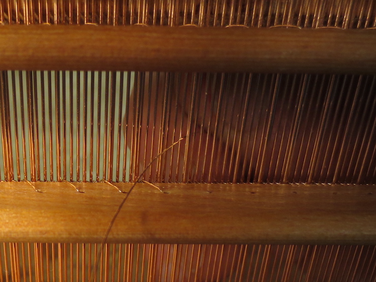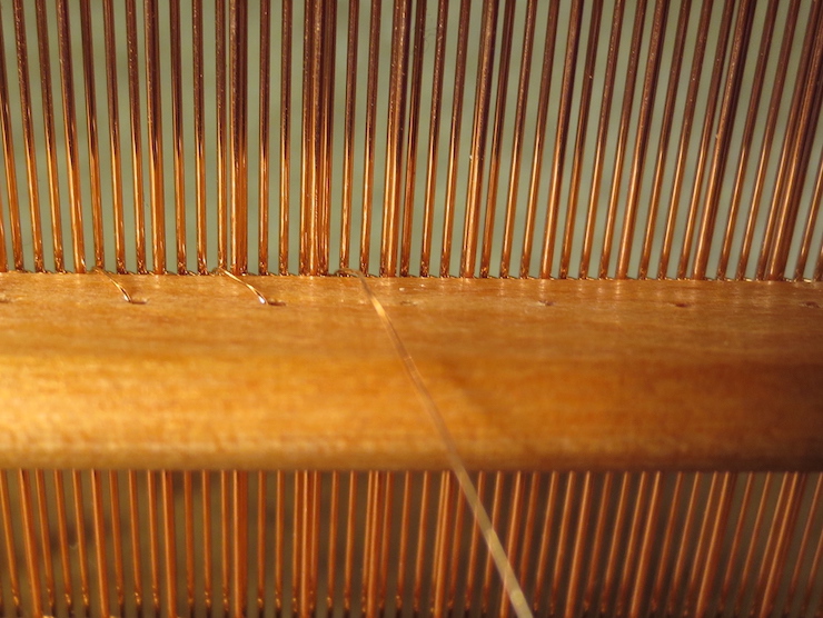 The sewing wire makes a clockwise spiral looking from near to far. Like the thread on a standard screw. (The chain wires are twisted the same way; I wonder if anyone knows what proportion of moulds in history have right-hand twists. ) A sewing wire passes over the chain wire at regular intervals, between laid wires and through the holes in the ribs to stitch the wire parts to the mould frame. The sewing wire should never cross a laid wire; that stitch would ‘stick up’ and leave a light (thin) spot there in every sheet of paper formed.