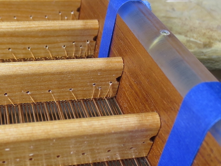 The main function of sewing is simply to hold the wires securely in place. Each stitch secures a very small area of facing wires; not much force is needed for that. That said, there shouldn’t be too much slack in the sewing wire either. A laid mould MUST be sewn. The chain wires are relatively fragile (and there aren’t many of them) compared to the hundreds of laid wires. They aren’t strong enough to hold the facing together without help from the wire stitches, which evenly distribute the forces that the facing must withstand in use. If the mould were left unsewn, the chain wires would stretch from the weight of all the laid wires, especially during couching (the larger the mould, the worse this would be). A laid wire facing is not strong enough to be attached to the mould only at the edges. It would pull out from under the copper strip and wires would soon begin to bend and break. (On a sewn mould the edges of the wire aren’t really attached along the upper rim of the mould. The twists and laid wire ends are only held in place and protected by the strips of copper but are not themselves fixed to the wood.)