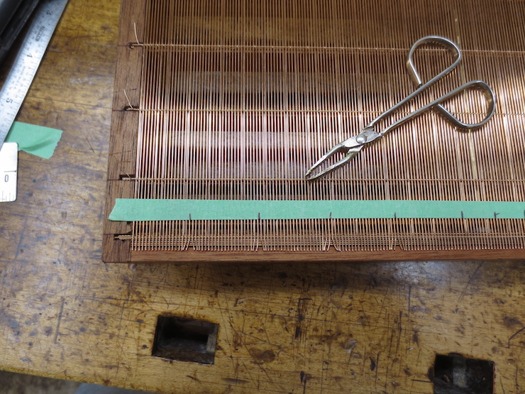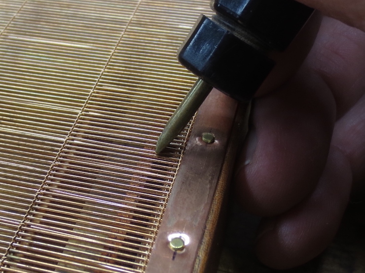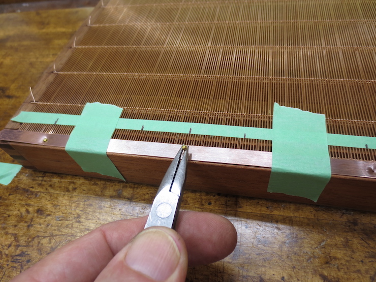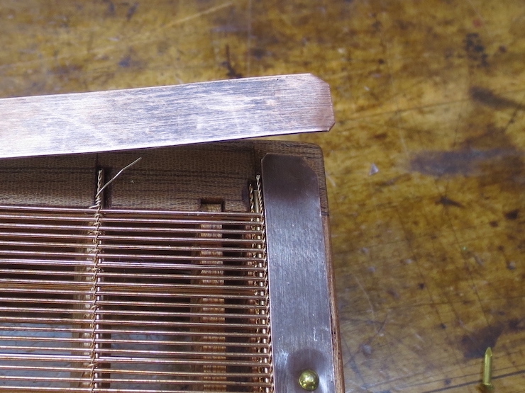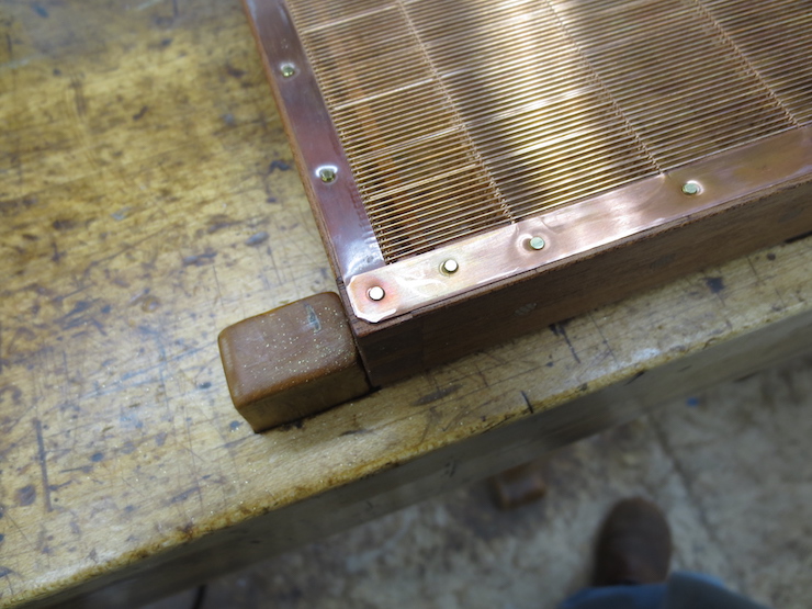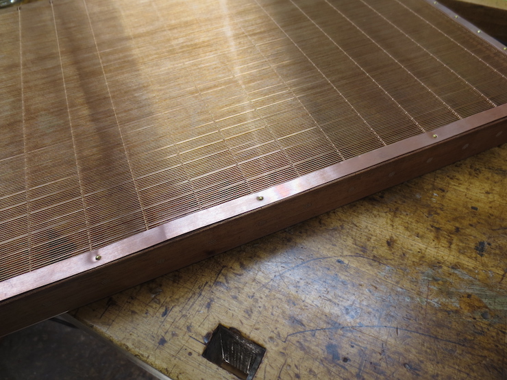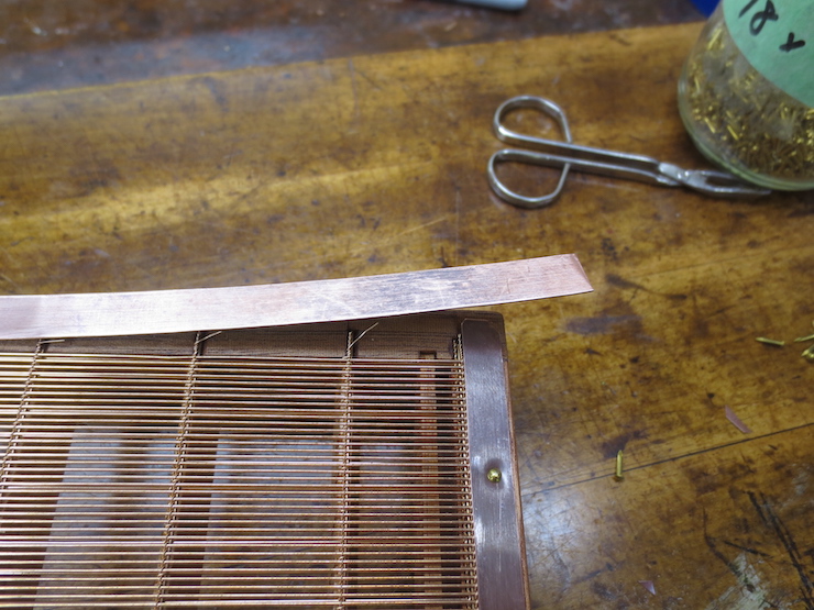 Copper shim stock .015″ thick makes good edge strips. These are needed to protect the edges of the laid and chain wires. But before the strips can be fastened in place there are a few more steps to be done.