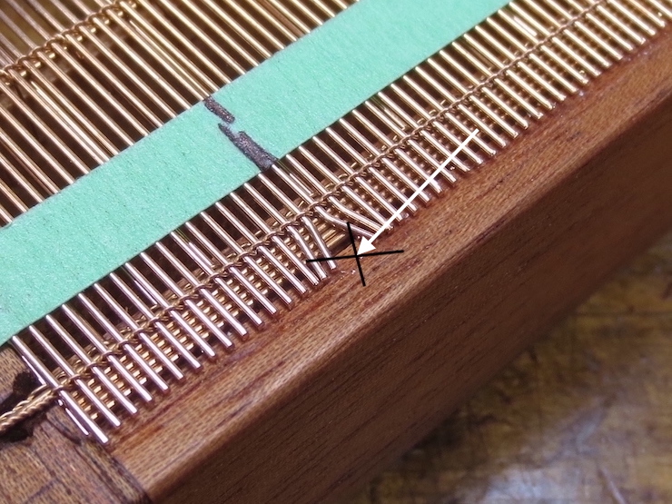 Bridge wires are inserted between the laid facing and the laid backing at both ends. These add support to the top wire layer so it won’t be distorted as badly when the strips are nailed down.