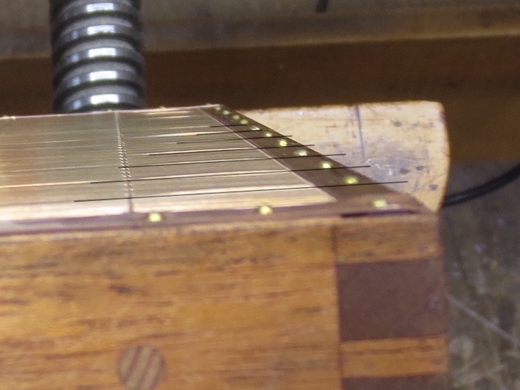 The locations of nails are marked and laid wires are bent sideways to make room for the brass escutcheon pins that will be hammered in about every inch.