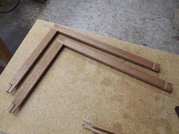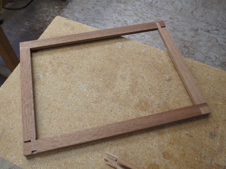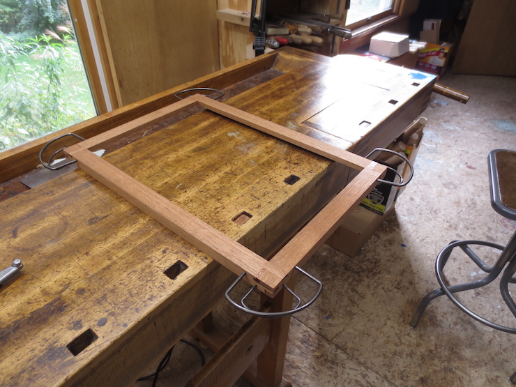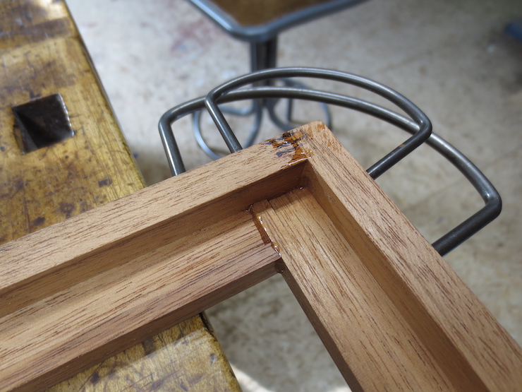 Epoxy has been applied to both sides of every surface in the joint (see the post “Gluing Moulds”). Then the parts have been fitted together and clamped. These picture frame clamps dig into the wood but they work well, putting pressure right where it’s needed. The edges will be rounded off anyway.